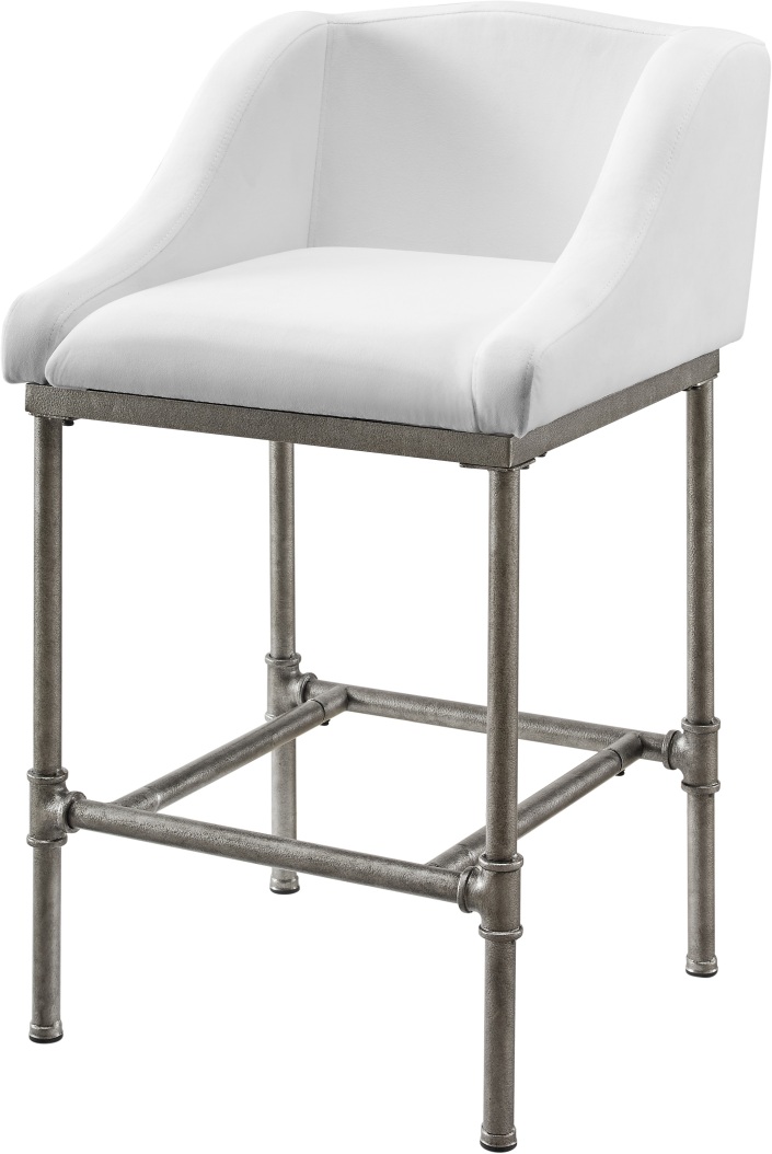 The Dillon Non-Swivel Counter Height Stool is a unique marriage of modern and industrial. A wide-set metal base finished in textured silver contrasts nicely with the white upholstered low curved wing back style. The white performance fabric has a stain, wrinkle protective finish making for easy clean up of your liquid spills adding for prolonged usage. It features a pipe joint base structure sure to catch the eye wherever this metal stool rests. Comfortable and sturdy, this counter height stool brings an uncommon flair to your counter height dining table or kitchen island. Assembly required.
