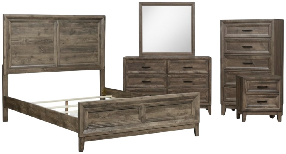 Enhance your home with the Ridgecrest queen panel bed, dresser, mirror, chest, and nightstand. Crafted of rubberwood solids with paper laminate, this kit features a cobblestone finish, picture frame cases, tapered feet, drawer fronts with canted moldings, paper laminate drawer interiors, and is accented with antique brass bar pull hardware.Read More
