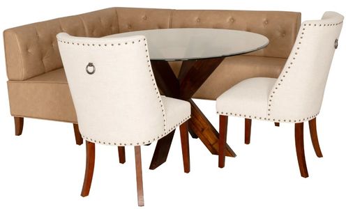 Complete 5-Piece Dining Set: Includes a 3-piece upholstered corner bench, two faux leather dining chairs, and a 48” round glass top dining table.