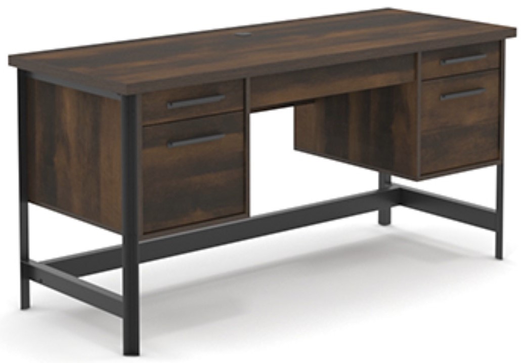 This home office desk with storage features a large middle shelf with a flip-down panel for a keyboard and mouse to keep your top surface free of clutter. This home wood desk includes two small drawers with full extension slides for convenient storage of supplies like your stapler, pad of paper, or planner. The lower drawers that open on full extension slides accommodate letter or legal-size hanging files so your most important documents are organized and easy to find. This computer desk with drawers accommodates an optional Hidden Wireless Qi Compatible Charger by Eggtronics 425905 (sold separately – visit sauder.com for more information) to ensure your phone never runs out of charge when you need it most. Finished on all sides for versatile placement, this double pedestal executive desk will look polished from every angle—with added powder-coated metal frame for durability and design. A Barrel Oak™ finish is rustic, while modern, look that your office has been looking for.
