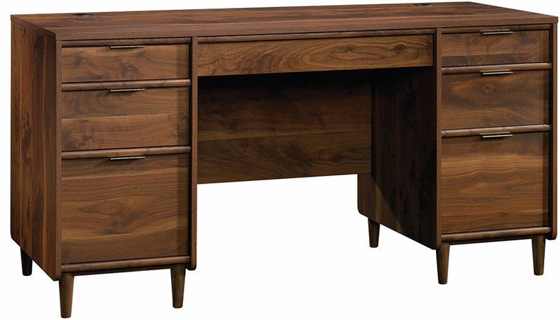 Whether you’re looking for a place to get some work done or just need another surface to stack your mounds of paper, this desk from the Clifford Place collection is perfect for you. It features a large drawer/shelf with a flip-down panel for your keyboard/mouse, four easy gliding storage drawers, and two files drawers with full extension slides for letter-size hanging files. Finished in Grand Walnut and detailed with solid wood feet, this stylish desk is just what your home or office has been looking for.