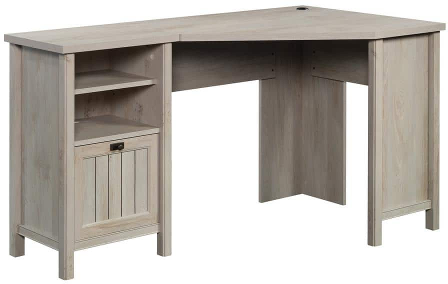 Maximize the space in your home or office with this corner computer desk from the Costa collection. An open storage area features an adjustable shelf, allowing you to customize your computer desk. This corner desk with storage accommodates optional Hidden Wireless Qi Charger by Eggtronics 425905 (sold separately – visit sauder.com for more information). A cord management system including a desktop grommet keeps your new desk tidy and free of cord clutter. Quick and easy assembly with slide-on moldings ensures that your new corner desk will be put together in no time. Finished in a light Chalked Chestnut®, this computer desk with file drawer is the ideal space-saving addition to your home office, kitchen or anywhere you need a simple solution.
