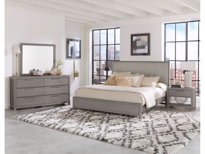 The cases feature an oversized brushed metal bar pull that is located at the top of each drawer. The location of the hardware allows for the wire brushed distressing to be the focal point of each piece, while at the same time the color of the hardware correlates seamlessly to the metal caps used on both our bed and mirror. The depth of the raised panels on our panel bed adds an extra level of interest, and the grey fabric used on our upholstered bed compliments each finish perfectly. The blend of natural finishes with classic contemporary styles truly allows American Modern to work in practically every household.
