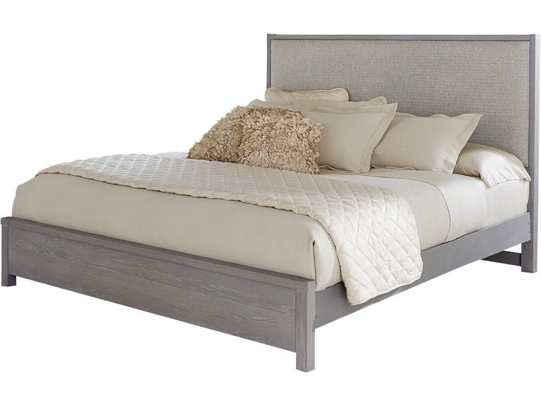 The cases feature an oversized brushed metal bar pull that is located at the top of each drawer. The location of the hardware allows for the wire brushed distressing to be the focal point of each piece, while at the same time the color of the hardware correlates seamlessly to the metal caps used on both our bed and mirror. The depth of the raised panels on our panel bed adds an extra level of interest, and the grey fabric used on our upholstered bed compliments each finish perfectly. The blend of natural finishes with classic contemporary styles truly allows American Modern to work in practically every household.
