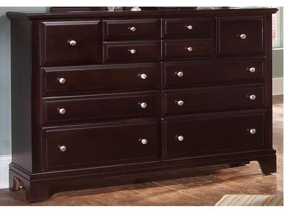 Create a sophisticated and elegant atmosphere in your home with this seven drawer dresser chest. This symmetrical chest has curved bracket feet that are complemented by the straight side panels. The silver circular knobs add a ravishing touch to the drawers and give this piece an overall dazzling look. Place a mirror on top of this dresser and give it a finished look. This dresser also looks great next to a traditional bed.