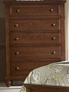 Vaughan Bassett Carolina Cottage Chest offers five drawers with a cherry color finish. This chest has turned feet with metal on metal drawer glides for proper construction.