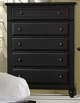 Vaughan Bassett Carolina Cottage Chest offers five drawers with an ebony color finish. This chest has turned feet with metal on metal drawer glides for proper construction.