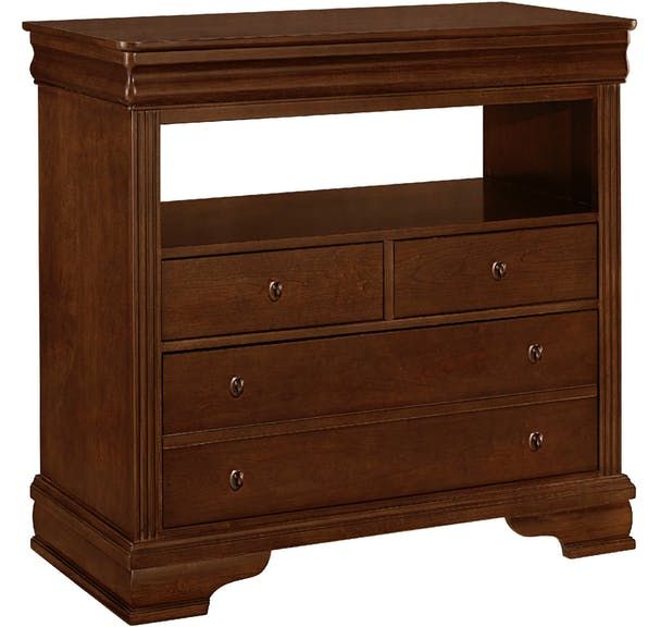 Bracket feet and unique hardware pulls add a dose of French Louis Philippe inspired design to this media chest. Built of quality materials in the USA; you will be proud to add this fantastic bedroom storage piece to your home. It accommodates a bedroom TV on top of the chest; while an open shelf is perfect for components. The three additional drawers for storage allow you to organize your clothing with ease.