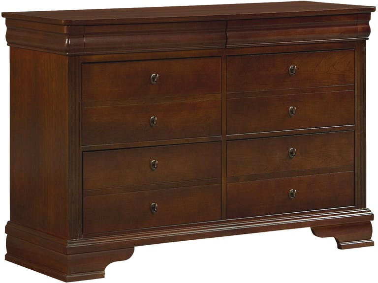 Bracket feet and unique hardware pulls add a dose of French Louis Philippe inspired design to this 52" dresser. Built of quality materials in the USA; you will be proud to add this fantastic bedroom storage piece to your home. Its six drawers for storage allow you to organize your clothing with ease. Hidden felt lined drawer located in the molding over each top drawer.