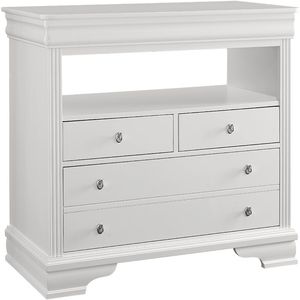 Bracket feet and unique hardware pulls add a dose of French Louis Philippe inspired design to this media chest. Built of quality materials in the USA; you will be proud to add this fantastic bedroom storage piece to your home. It accommodates a bedroom TV on top of the chest; while an open shelf is perfect for components. The three additional drawers for storage allow you to organize your clothing with ease.