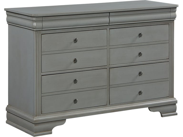 Bracket feet and unique hardware pulls add a dose of French Louis Philippe inspired design to this 52" dresser. Built of quality materials in the USA; you will be proud to add this fantastic bedroom storage piece to your home. Its six drawers for storage allow you to organize your clothing with ease. Hidden felt lined drawer located in the molding over each top drawer.