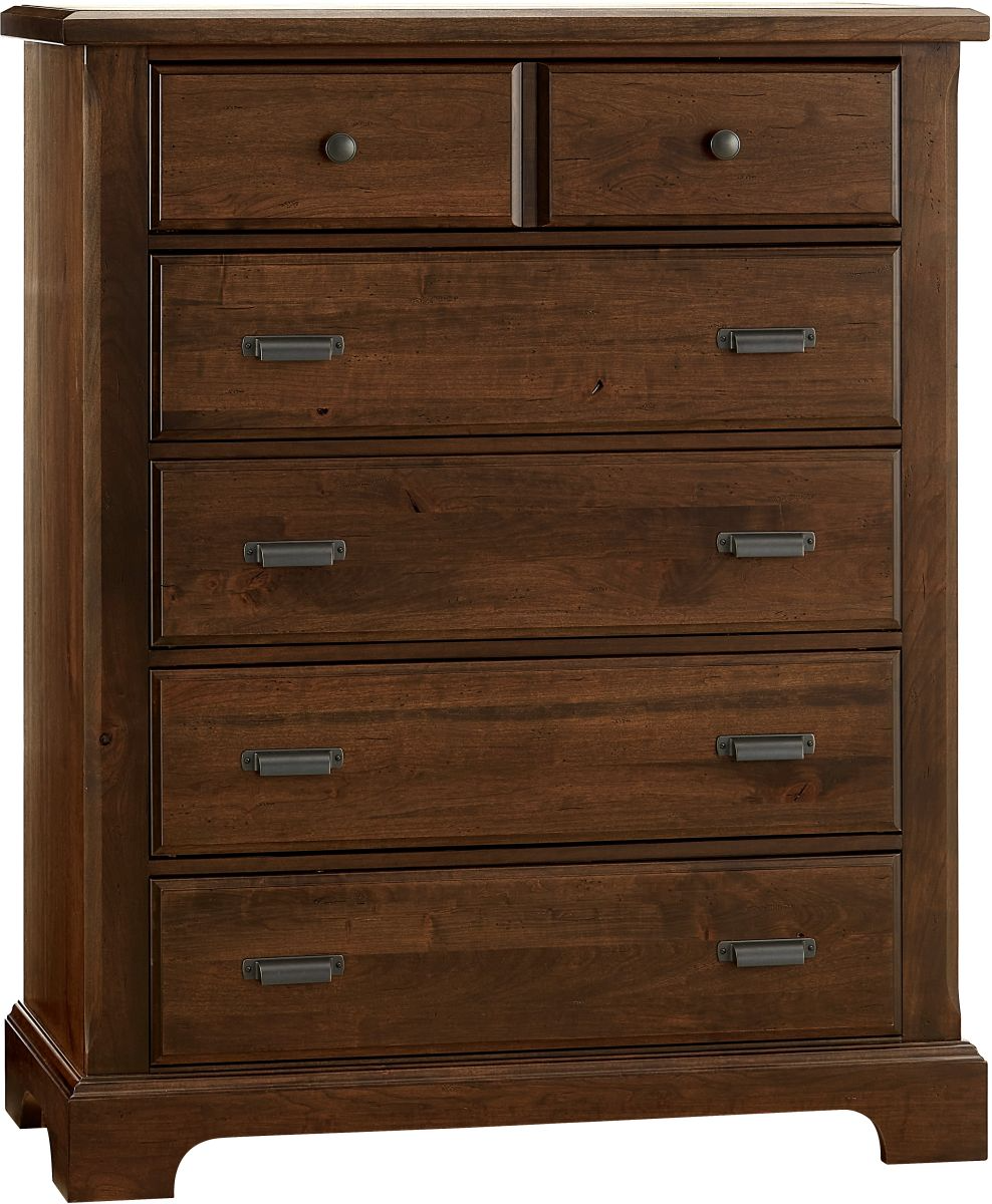 Five drawer chest in solid rustic cherry and cherry veneers. With rustic cherry; we have left in many of the cherry knots to accentuate the unique grain pattern only found in American cherry lumber. Features custom-designed drawer hardware includes cup pulls and knobs with an antiqued bronze finish.Read More
