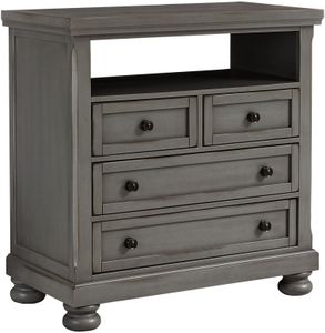A sleek cross-functional addition to the bedroom in your home; this entertainment center media chest will add sizable storage to your home as well as a perfect space for media players and a TV in your bedroom. With four storage drawers and an open shelf; this piece accommodates your media and clothing or accessory storage needs to complete a smart and functionally designed piece for your home; saving space and adding elegance. Made in a the USA from quality materials; this is a piece you will be proud to use for daily for housing a bedroom TV.